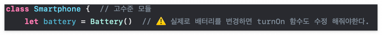 1. 만약 성능 좋거나, 버전이 다른 Battery 를 추가하려면 Smartphone(고수준 모듈)을 수정해야 함.