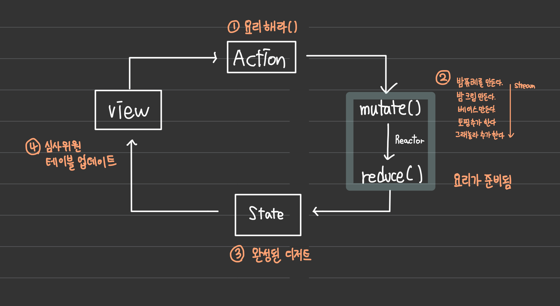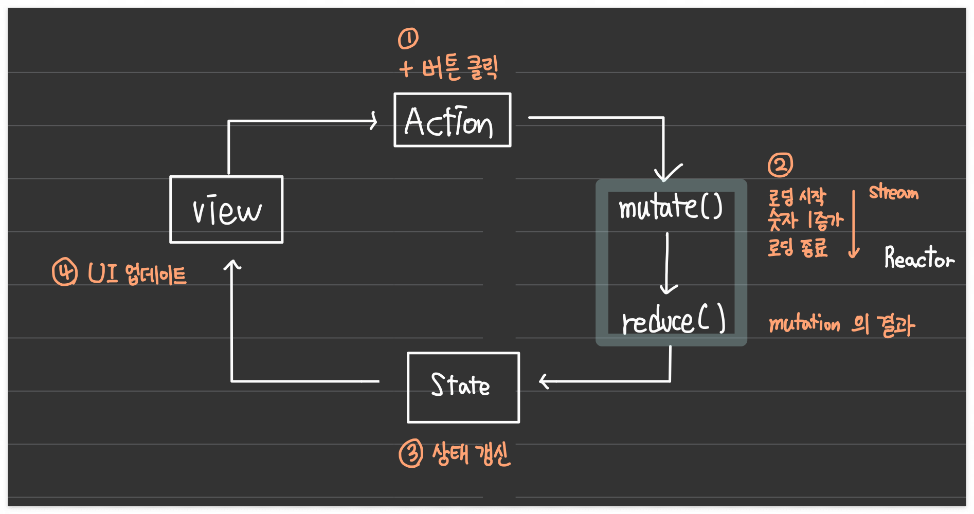 대신, 클래스 내부에서 Action과 State를 연결하는 역할을 수행합니다. Action이 리액터에 전달되면 두 단계를 거쳐서 뷰의 상태를 변경합니다.
