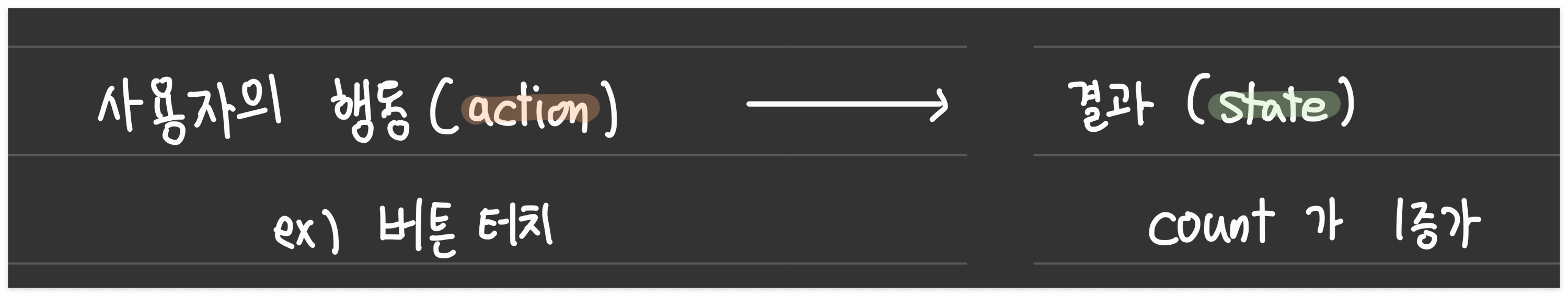쉽게 말하면, 유저가 터치해서 발생하는 이벤트가 Action이고, 그 이벤트로 인해 변경되는 것이 State라고 생각하면 돼요!